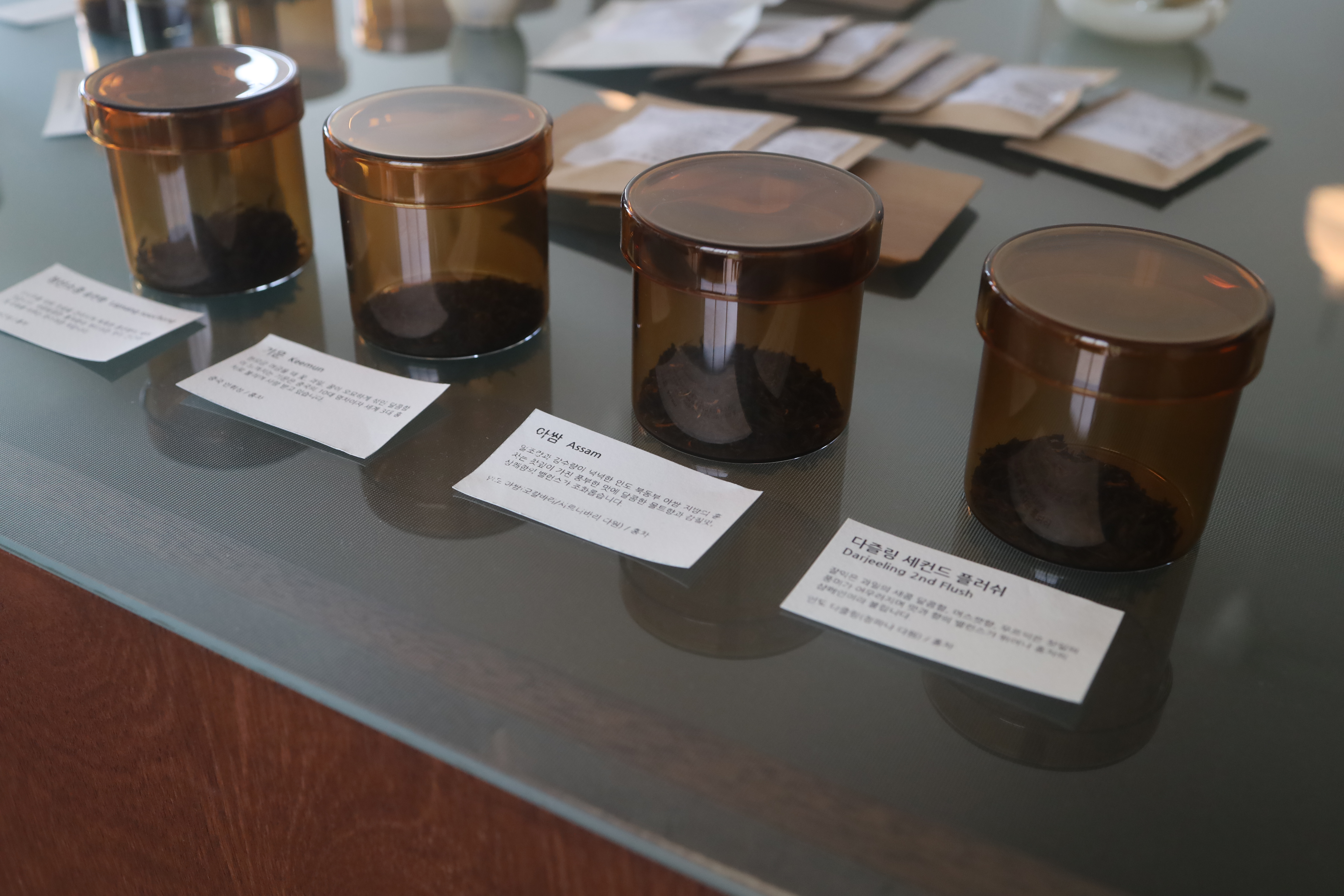 카페 가운데에 위 사진처럼 다양한 종류의 차 샘플이 비치되어 있는데, 차를 고를때 해당 차가 궁금하거나 향을 맡아보고 싶으면 가서 확인해 볼수도 있게 되어 있다.